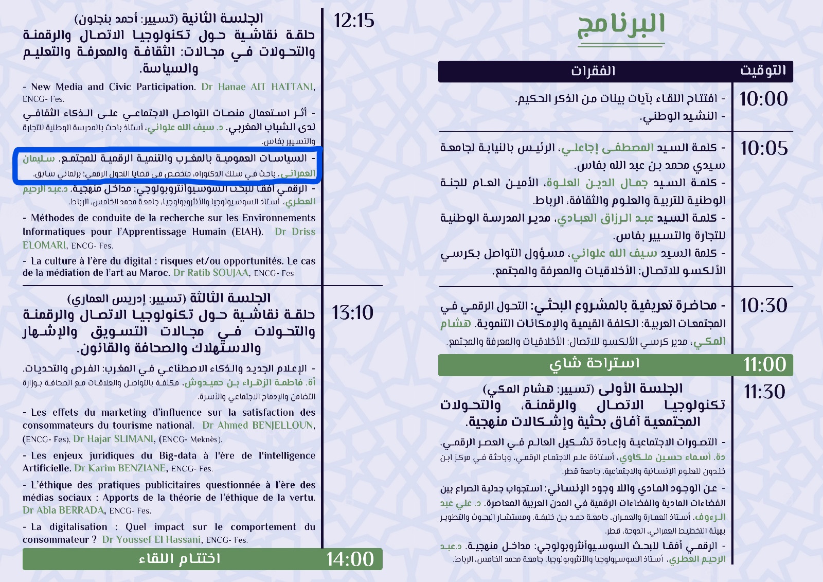 وللإشارة يسعد سليمان العمراني أن يشارك في هذا المشروع الهام، وأن يحضر أشغال اللقاء الدراسي الذي سيعطي انطلاقته، وقد شرفه المنظمون بتقديم عناصر ورقة بحثية في الحلقة النقاشية الأولى بعنوان: ‘‘السياسات العمومية بالمغرب والتنمية الرقمية للمجتمع”.