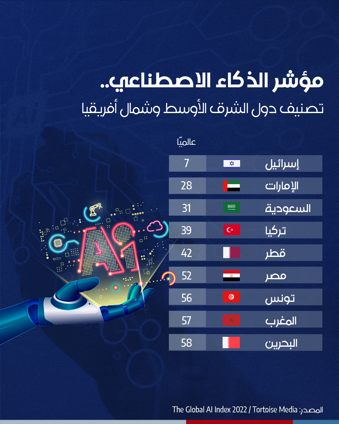أصدر الموقع “تورتواز ميديا“( tortoisemedia)، الذي يعود لشركة عالمية تضم مجلسا استشاريا عالميا وخبراء في الذكاء الاصطناعي، مؤشر الذكاء الاصطناعي عن سنة 2023، مصنفا 62 دولة حسب قدراتها في مجال الذكاء الاصطناعي.